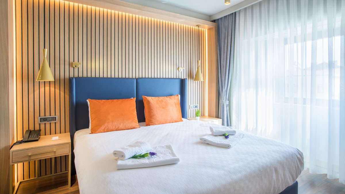 Özel tasarım güneş geçirmez perdeler, modern ahşap mobilyalar ve eşsiz deniz manzarasıyla Corner oda, banyo dahil konforlu bir deneyim sunar.